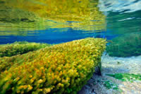 Algae are most commonly found in aquatic bodies, though few also survive on rocks or hard substances in humid places. They are said to be related to the plants, and contain chlorophyll, though they lack roots and stems. Algae can grow from microscopic size to over 100 feet in length, depending on the type. They can also reproduce in many ways from simple asexual cell division to complex forms of sexual reproduction. Algae are classified into six phyta, mainly, Crysophyta, Euglenophyta, Pyrrophyta, Chlorophyta, Phaeophyta and Rhodophyta. It is believed that the first plants on earth originated from freshwater algae, such as Chara. Some species of algae can form a symbiotic relationship with other organisms, where they provide organic substances. Lichens, coral reefs and sea sponges are a few of these organisms that receive nutrients from algae. Edible forms of algae include seaweeds.