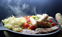 Sizzler chicken, on the other hand, is cooked in a heated pan smeared with oil and is served on an iron plate. The name, sizzler chicken come from the sizzling sound that the chicken makes as it is served on the iron plate due to the butter on the plate.