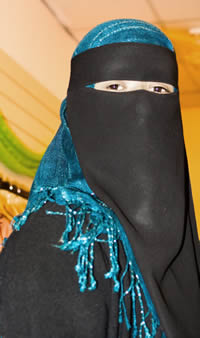 A niqab or ruband is a part of the sartorial hijab and covers only the face. It is a form of a veil that covers the face including the ears and the hair. The headpiece may even cover some, if not all of the neck and chest area. The niqab has a split in the eye area, which leaves the eyes uncovered. However, some niqabs may have a cloth mesh covering the eye area. The niqab can be attached or tied to the woman’s head by laces or by clips.