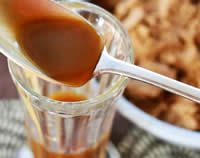 Caramel can be used in many different forms such as flavoring for puddings and desserts, filling in bonbons, éclairs and chocolates, as a topping for ice cream, custards, caramel apple and caramel corn and in the form of caramel sauce and caramel candy. Caramel sauce is made by heating water and castor sugar on low temperature, until the sugar caramelizes, after which butter and heavy whipping cream or heavy cream, (whatever the recipe calls for) is added. The mixture is heated for a while longer, before it cooled and served. Caramel candy is a soft, dense, chewy candy made by boiling a mixture of milk or cream, sugar(s), butter, and vanilla flavoring. This is a popular candy that is sold wide-wide by many companies. Caramel toffees are hard caramel candies that are made by cooling caramel and allowing it to harden.