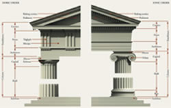 include("ad3rd.php"); ?>The entablature is divided into three horizontal registers. The lower part is either smooth or divided by horizontal lines. The frieze is divided into triglyphs and metopes. A triglyph is a unit consisting of three vertical bands which are separated by grooves. Metopes are plain or carved reliefs.