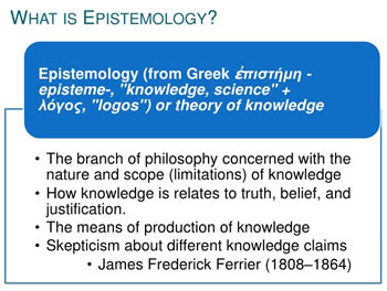 The purpose of Epistemology is to try to figure out what constitutes as knowledge. Does just knowing something constitute as knowledge? Does one have to study it or thoroughly understand it to constitute knowledge? There is no correct or wrong answer to these questions. For every example that proves these assumptions to be correct, there are a ton more that disprove it. So, it begs to ask the question, what is exactly knowledge? Sadly, there is not correct answer to that question either, which is why it is philosophy.