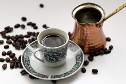 Turkish coffee is prepared from the Turkish coffee beans, which are grounded and pounded into fine powder from. The coffee preparation consists of immersing the coffee grounds in water which is most of the time hot but not boiling for long enough to dissolve the flavor some compounds. Followed by a prolonged boiling, which gives an unpleasant "cooked" or "burnt" taste, very brief boiling is not done.