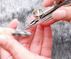 Airbrush nail Art: Airbrush machines are used for spraying paint on nails. These are usually used with stencils or stickers to get the desired look. After a base coat, the stencil is placed on the nail and the airbrush machine is used for painting the design. Later the stencil is gently removed, and acetone is used for taking out the split paint.
